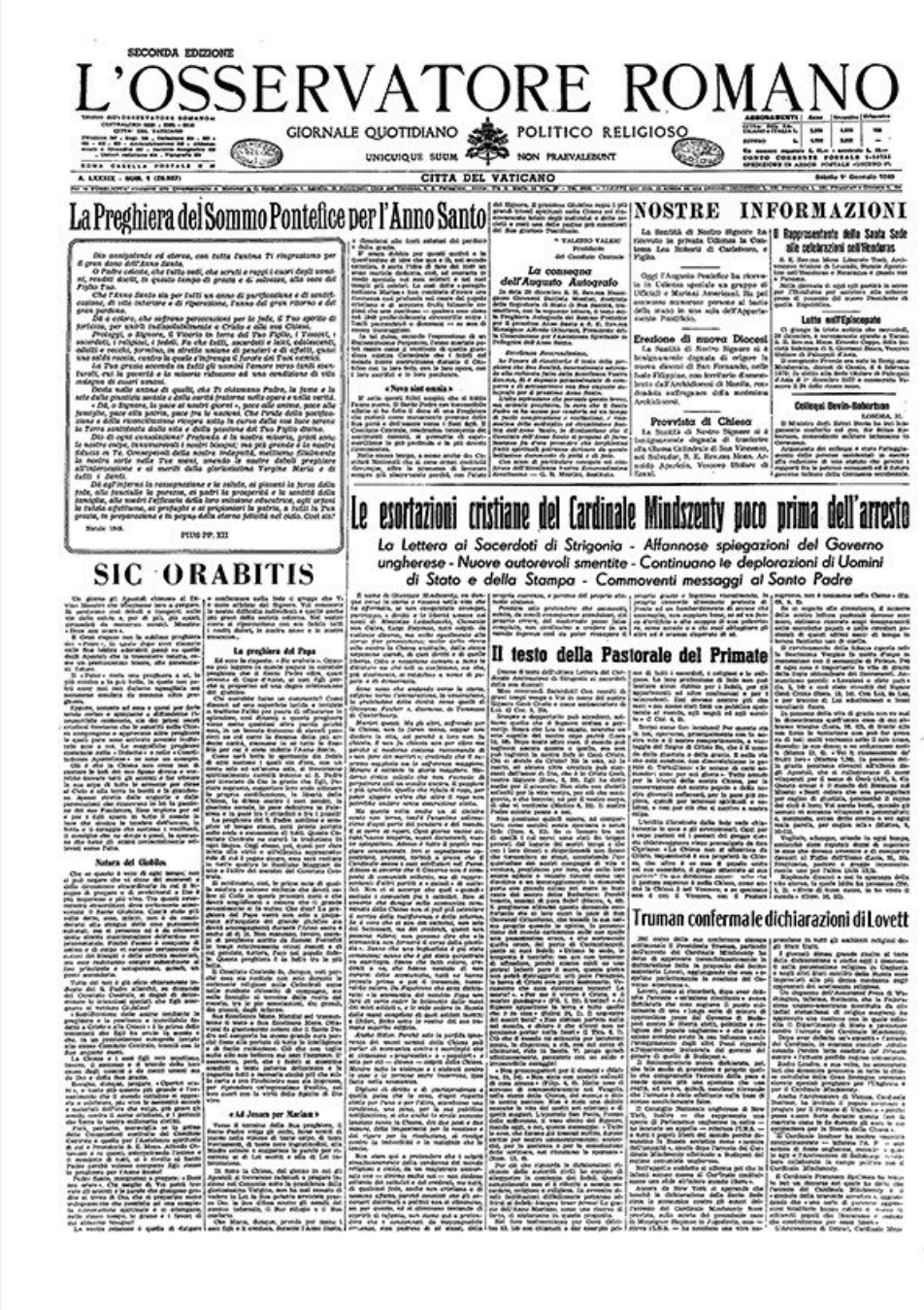 La copertina de L’Osservatore Romano del 1 gennaio 1949 con la preghiera di Pio XII