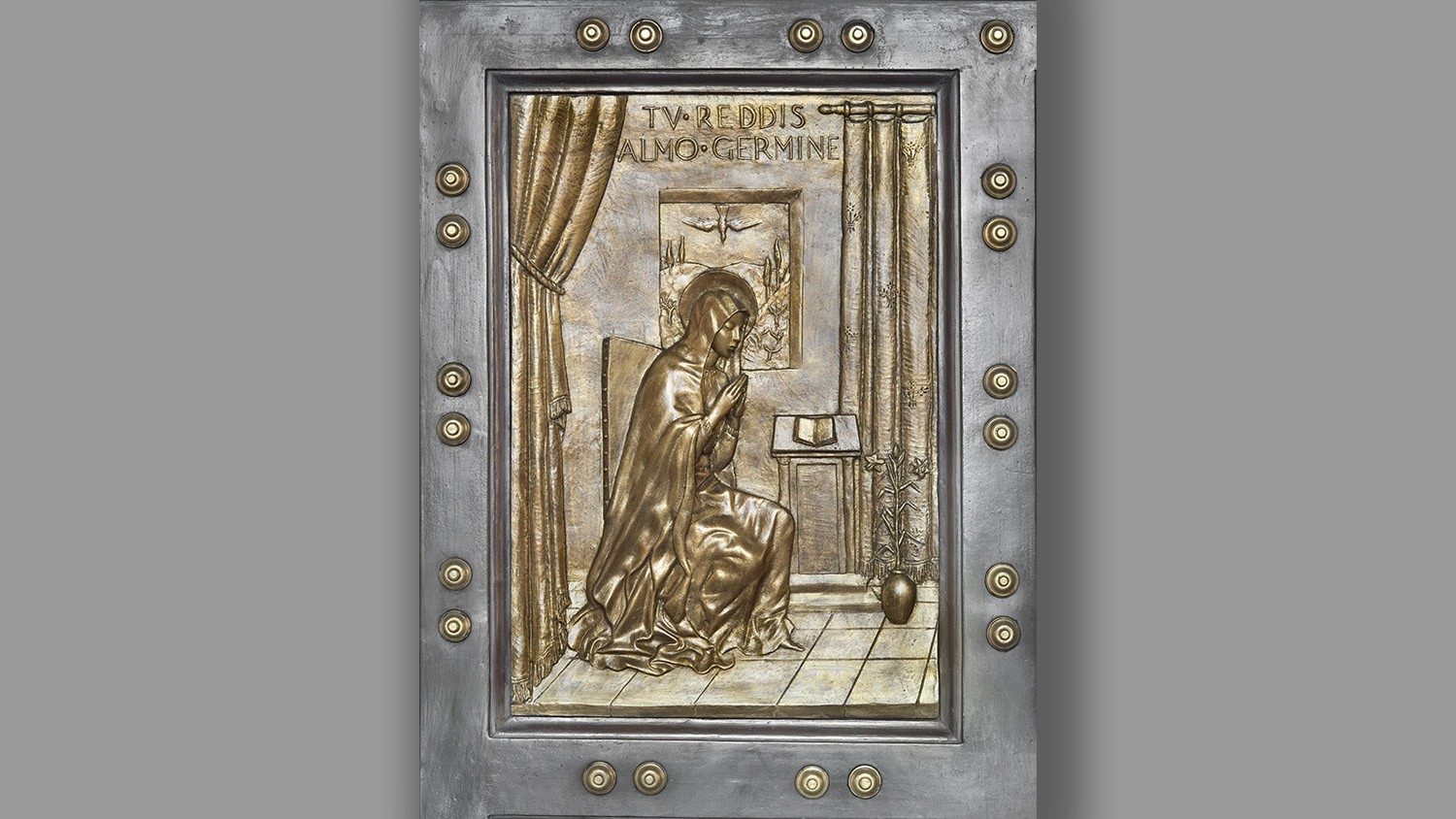Nei sedici pannelli sui due battenti in bronzo Consorti racconta per immagini accompagnate da didascalie, episodi biblici che affrontano i temi del peccato dell’uomo e il perdono divino. Dalla fuga scomposta dei progenitori e degli animali dal Paradiso terrestre alla quiete intima dell’Annunciazione in cui Maria con il suo “sì” ricorda che Dio non è un rivale, ma il vero e unico amico dell’uomo.
